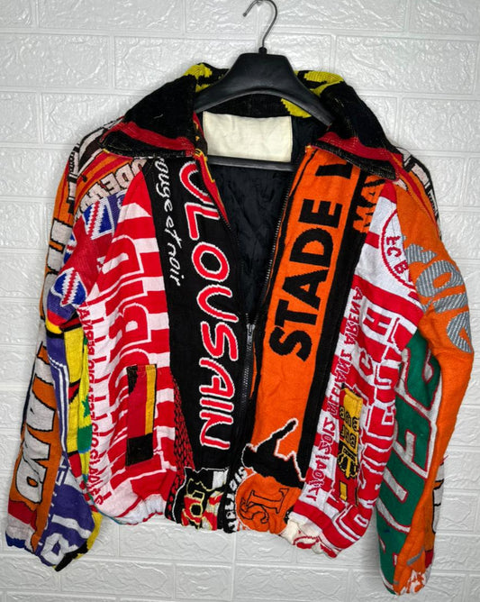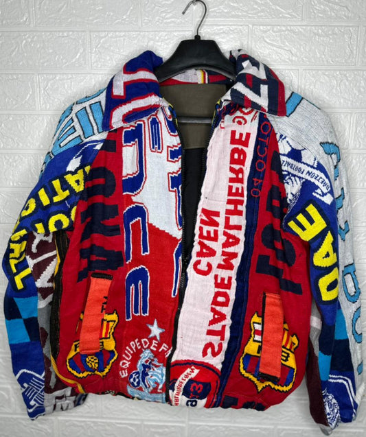 Upcycled Rework Football Scarf Jacket – Handmade Patchwork Streetwear Coat – Soccer Fan Vintage Style – Size Large