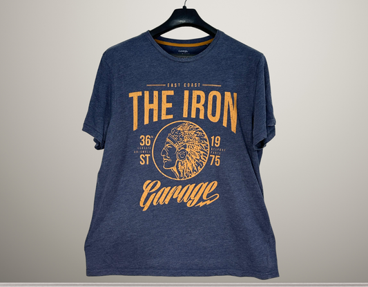 The Iron Garage Graphic T-Shirt | Vintage East Coast Style Tee | Classic Heritage Print | Navy Blue XL