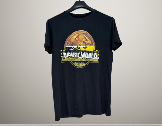 Jurassic World Graphic T-Shirt | Dinosaur Park Logo Tee | Black Movie Fan Shirt | Vintage Adventure Style | Large Size