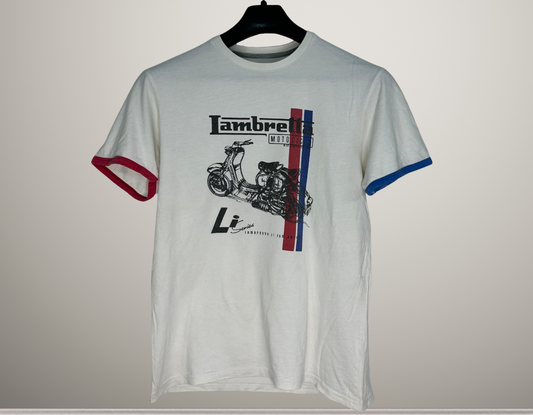 Lambretta Motorcycles Graphic T-Shirt | Vintage Scooter Li Series Tee | Red & Blue Trim | Medium Size