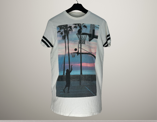 Sunset Basketball Court Graphic T-Shirt | Size Large | Palm Trees & Hoop Print | Streetwear Style