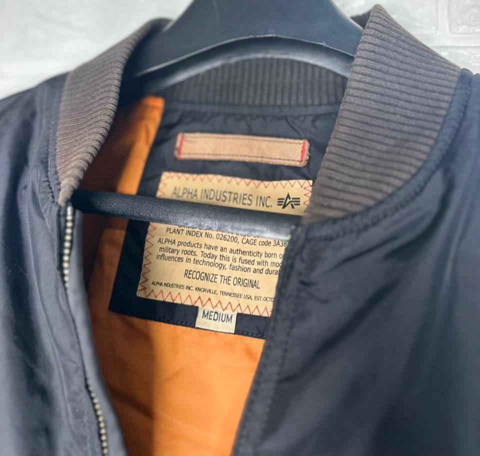 Command attention with this authentic Alpha Industries MA-1 bomber jacket. This iconic piece is a timeless staple for any wardrobe, featuring a durable black outer shell and a vibrant orange lining. The jacket comes with the distinct "Veterans For Veterans" chest patch, adding a layer of authenticity and meaning. In a Medium (M) size, this jacket offers a comfortable fit with its full-zip front, ribbed collar, and sleeve pocket detail, making it perfect for a rugged, streetwear look.