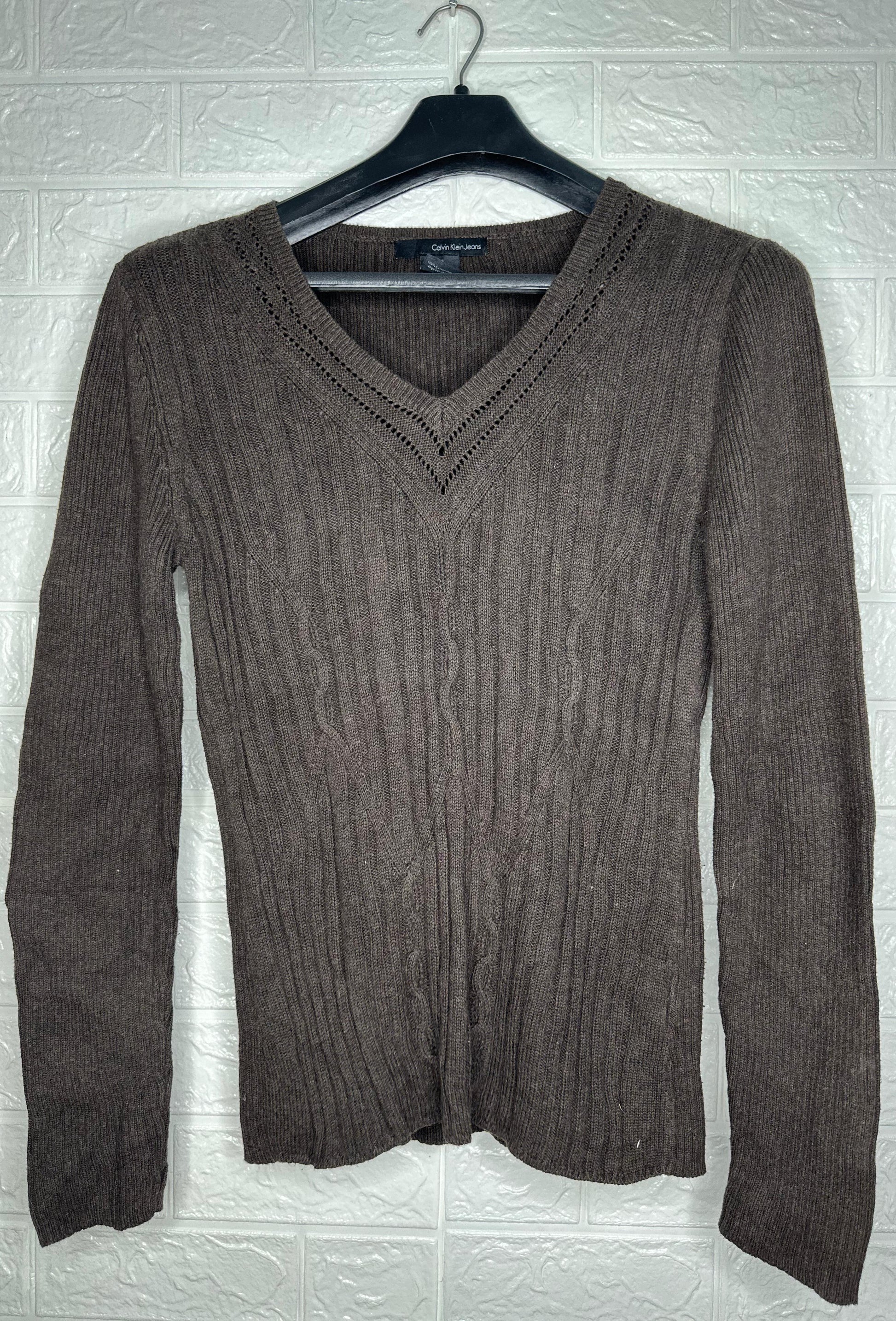Description Add a classic touch to your wardrobe with this stylish Calvin Klein Jeans V-neck sweater in size Large. This brown pullover features a ribbed knit design with a unique perforated detail along the neckline, giving it a modern and fashionable look. It's a comfortable and versatile piece perfect for layering during cooler weather or wearing on its own for a sleek, casual style.