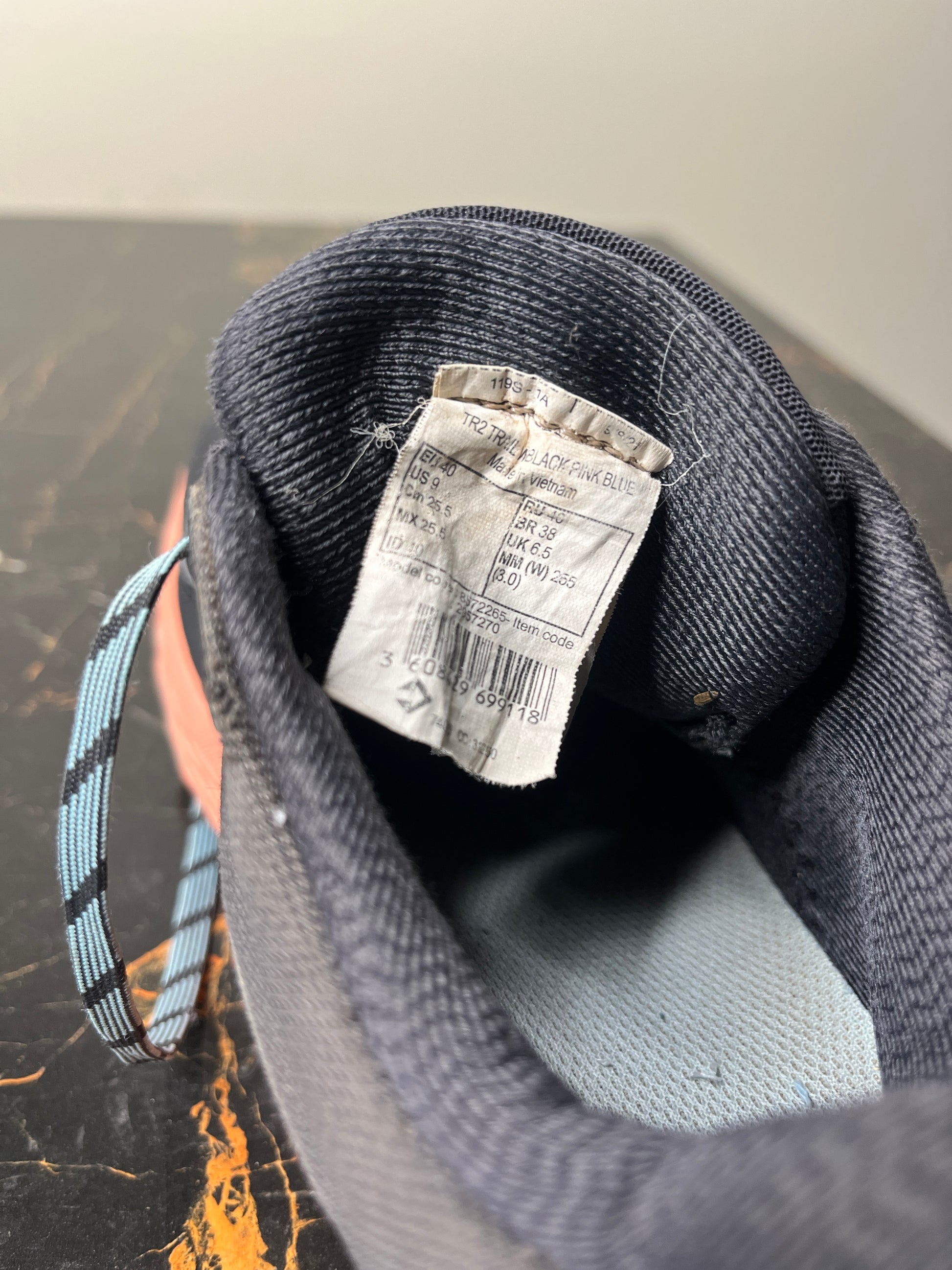 Stylish Design: Sleek black upper with coral-pink midsole and blue lace accents for a bold look.