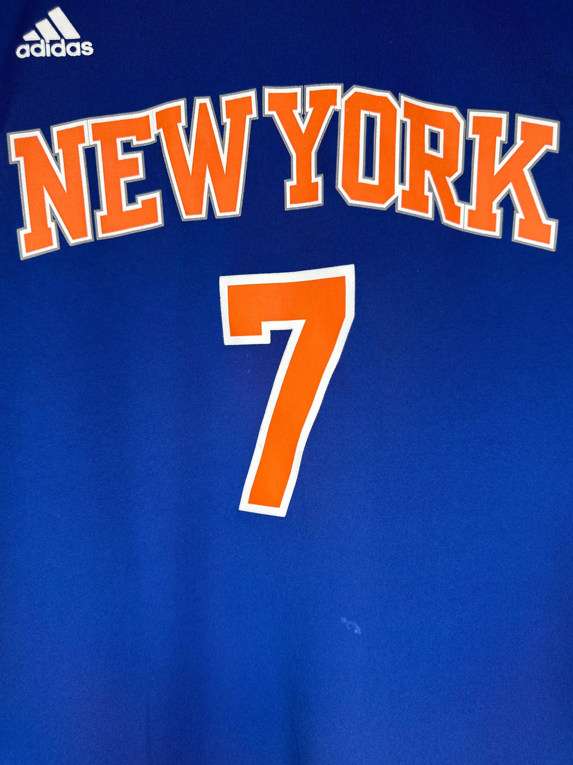 Show your love for the New York Knicks with this official Adidas NBA T-shirt. Featuring the bold NEW YORK lettering and #7 on the front, this shirt comes in the teamβs classic blue and orange colors. A comfortable and stylish piece for both basketball fans and casual wear.