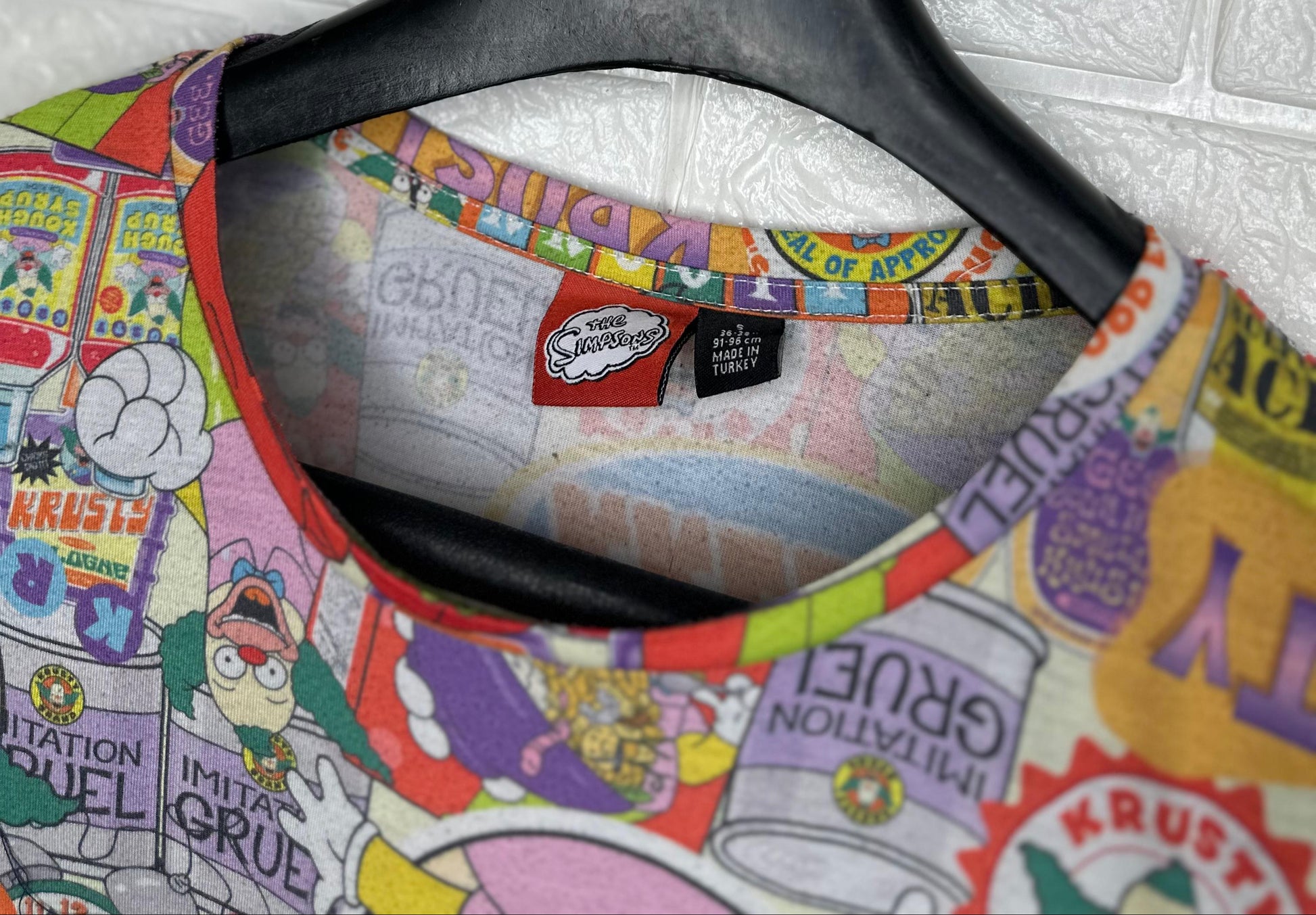 š Description Step into the world of Springfield with this eye-catching Simpsons graphic T-shirt in size Small. This vibrant tee features a bold, all-over print design packed with various comic book-style graphics of Krusty the Clown and other iconic elements from the show. It's a fun and playful piece for any fan of the classic animated series.