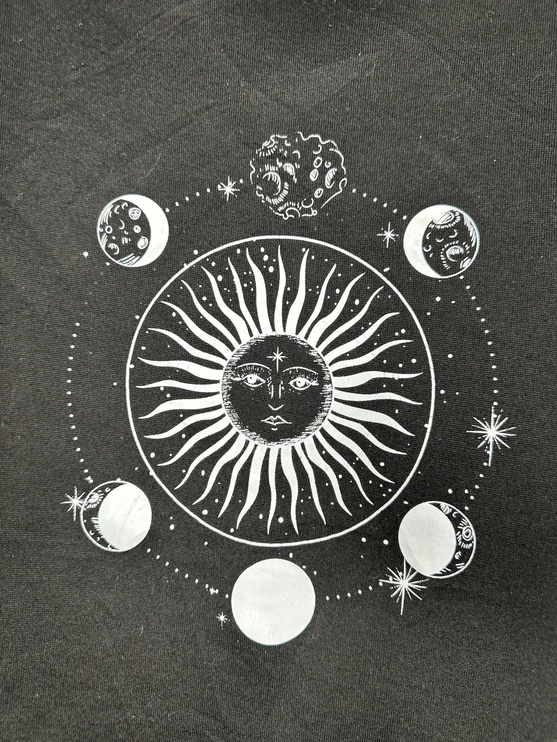 This Vintage Black Celestial Sweatshirt (Size Large) features a mystical Sun & Moon graphic print with lunar phases, giving it a unique boho and gothic vibe. Soft, cozy, and stylish, itβs the perfect pullover for astrology lovers, stargazers, or anyone who loves celestial fashion.